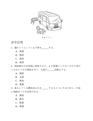 きゅうじょ 活学活用 1.溺れようとしている子供を______する。 A.救援 B.救助 C.援助 D.救済 2.消防隊が火災現場に到着すると、まず現場にとりのこされた者が いるかどうかの検索を行い、人命の______活動をする。 A.援助 B.支援 C.救助 D.救援 3.流入してくる難民10万人を______できるようにするために、早急 に3000万ドルが必要である。 A.救助 B.救出 C.整救 D.救援