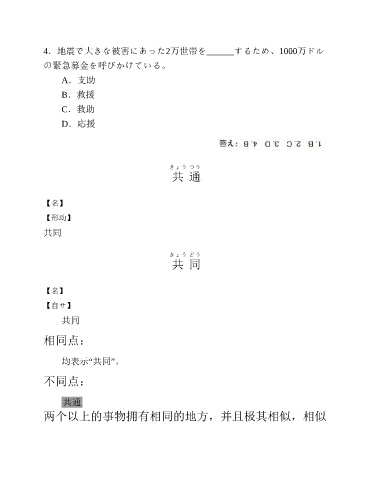 4.地震で大きな被害にあった2万世帯を______するため、1000万ドル の緊急募金を呼びかけている。 A.支助 B.救援 C.救助 D.応援 きょう つう 共 通 【名】 【形动】 共同 きょう どう 共 同 【名】 【自サ】 共同 相同点: 均表示“共同”。 不同点: 共通 两个以上的事物拥有相同的地方,并且极其相似,相似