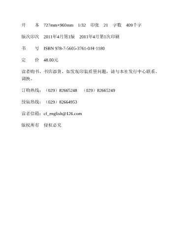 开 本 727mm×960mm 1/32 印张 21 字数 409千字 版次印次 2011年4月第1版 2011年4月第1次印刷 书 号 ISBN 978-7-5605-3761-0/H·1180 定 价 48.00元 读者购书、书店添货、如发现印装质量问题,请与本社发行中心联系、 调换。 订购热线:(029)82665248 (029)82665249 投稿热线:(029)82664953 读者信箱:cf_english@126.com 版权所有 侵权必究