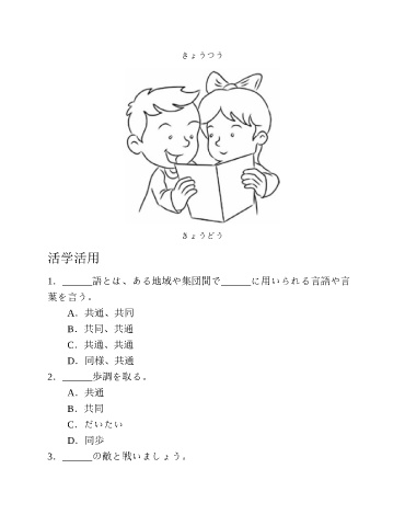 きょうつう きょうどう 活学活用 1.______語とは、ある地域や集団間で______に用いられる言語や言 葉を言う。 A.共通、共同 B.共同、共通 C.共通、共通 D.同様、共通 2.______歩調を取る。 A.共通 B.共同 C.だいたい D.同歩 3.______の敵と戦いましょう。