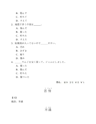 B.傷んで C.朽ちて D.すえて 2.地震で多くの家は______。 A.傷んだ B.腐った C.朽ちた D.すえた 3.防腐剤が入ってないので______やすい。 A.汚れ B.きずき C.腐り D.傷み 4.______りんごを安く買って、ジャムにしました。 A.腐った B.傷んだ C.朽ちた D.傷ついた く じょう 苦 情 【名】 抱怨,不满 ふ まん 不 満