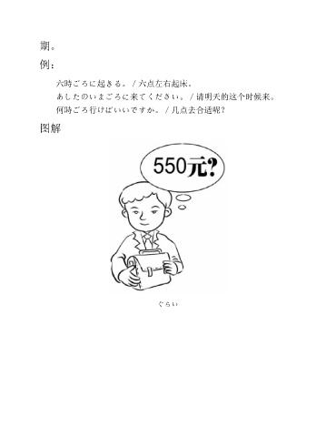 期。 例: 六時ごろに起きる。/六点左右起床。 あしたのいまごろに来てください。/请明天的这个时候来。 何時ごろ行けばいいですか。/几点去合适呢? 图解 ぐらい