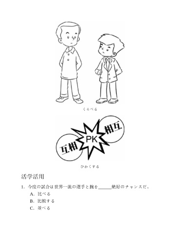 くらべる ひかくする 活学活用 1.今度の試合は世界一流の選手と腕を______絶好のチャンスだ。 A.比べる B.比較する C.並べる