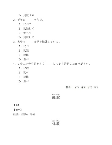 D.対比する 2.平年に______不作だ。 A.比べて B.比較して C.並べて D.対比して 3.大学で______文学を勉強している。 A.比べ B.比較 C.対比 D.並べ 4.この二つの単語をよく______してから選択したほうがよい。 A.比較 B.比べ C.対比 D.並べ けい けん 経 験 【名】 【他サ】 经验,经历,体验 たい けん 体 験