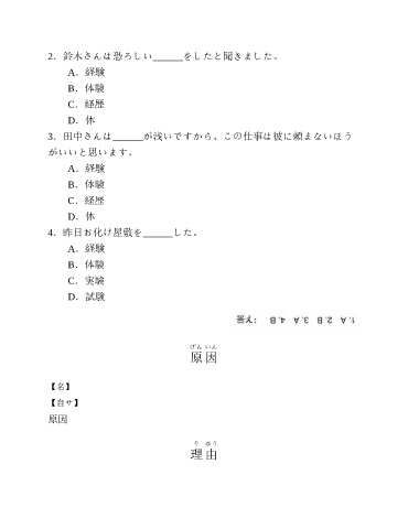 2.鈴木さんは恐ろしい______をしたと聞きました。 A.経験 B.体験 C.経歴 D.体 3.田中さんは______が浅いですから、この仕事は彼に頼まないほう がいいと思います。 A.経験 B.体験 C.経歴 D.体 4.昨日お化け屋敷を______した。 A.経験 B.体験 C.実験 D.試験 げん いん 原 因 【名】 【自サ】 原因 り ゆう 理 由