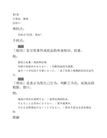 【名】 ①理由,缘故 ②借口 相同点: 均表示“原因、理由”。 不同点: 原因 「原因」是引发事件或状态的外部原因、因素。 例: 原因と結果/原因和结果 失敗の原因がわからない。/失败的原因不清楚。 寝タバコが原因で火事になった。/由于在床上吸烟的原因引起失 火。 理由 「理由」是表示为使自己行为、判断正当化,而找出的 根据、借口。 例: 遅刻の理由を説明する。/说明迟到的理由。 そんなことは理由にならない。/那不成理由。 それは全然理由のないことではない。/那并不是完全没有理由 的。 图解