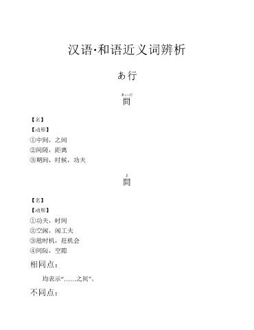 汉语·和语近义词辨析 あ行 あいだ 間 【名】 【动形】 ①中间,之间 ②间隔,距离 ③期间,时候,功夫 ま 間 【名】 【动形】 ①功夫,时间 ②空闲,闲工夫 ③趁时机,赶机会 ④间隔,空隙 相同点: 均表示“……之间”。 不同点: