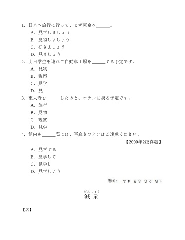 1.日本へ旅行に行って、まず東京を______。 A.見学しましょう B.見物しましょう C.行きましょう D.見ましょう 2.明日学生を連れて自動車工場を______する予定です。 A.見物 B.観察 C.見学 D.見 3.東大寺を______したあと、ホテルに戻る予定です。 A.旅行 B.見物 C.観賞 D.見学 4.館内を______際には、写真さつえいはご遠慮ください。 【2000年2级真题】 A.見学する B.見学して C.見学し D.見学しよう げん りょう 減 量 【名】
