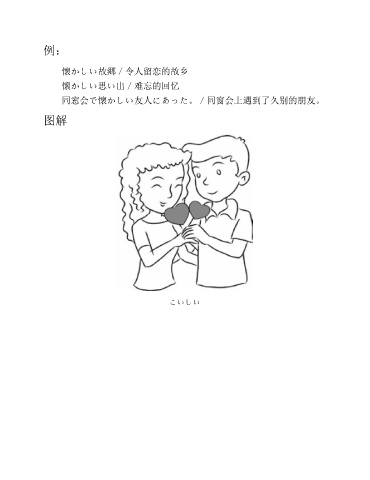 例: 懐かしい故郷/令人留恋的故乡 懐かしい思い出/难忘的回忆 同窓会で懐かしい友人にあった。/同窗会上遇到了久别的朋友。 图解 こいしい