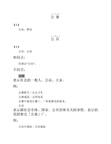 こう しゅう 公 衆 【名】 公众,群众 こう きょう 公 共 【名】 公共,公众 相同点: 均表示“公众”。 不同点: 公衆 表示社会的一般人、公众、大家。 例: 公衆衛生/公共卫生 公衆電話/公用电话 公衆の意見を聞く。/听取群众的意见。 公共 表示跟社会全体、国家、公共团体有关的事情。表示的 范围要比「公衆」广。 例: 公共の福祉/公共福祉