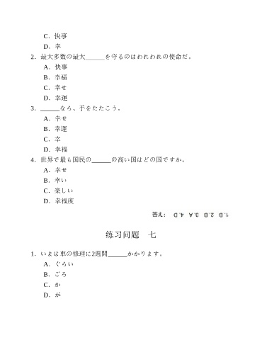 C.快事 D.幸 2.最大多数の最大______を守るのはわれわれの使命だ。 A.快事 B.幸福 C.幸せ D.幸運 3.______なら、手をたたこう。 A.幸せ B.幸運 C.幸 D.幸福 4.世界で最も国民の______の高い国はどの国ですか。 A.幸せ B.幸い C.楽しい D.幸福度 练习问题 七 1.いまは車の修理に2週間______かかります。 A.ぐらい B.ごろ C.か D.が
