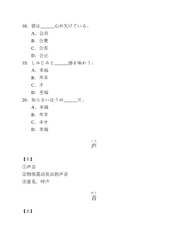18.彼は______心が欠けている。 A.公共 B.公衆 C.公有 D.公正 19.しみじみと______感を味わう。 A.幸福 B.至幸 C.幸 D.至福 20.知らないほうが______だ。 A.幸福 B.至幸 C.幸せ D.至福 こえ 声 【名】 ①声音 ②物体震动发出的声音 ③意见,呼声 おと 音 【名】