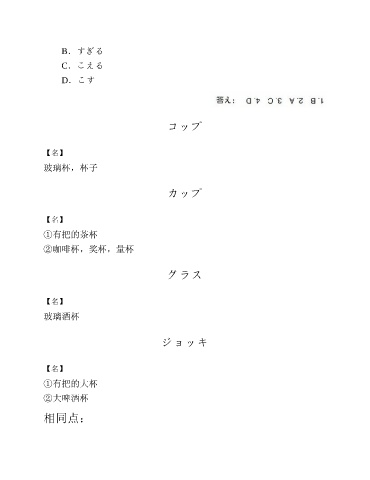 B.すぎる C.こえる D.こす コップ 【名】 玻璃杯,杯子 カップ 【名】 ①有把的茶杯 ②咖啡杯,奖杯,量杯 グラス 【名】 玻璃酒杯 ジョッキ 【名】 ①有把的大杯 ②大啤酒杯 相同点: