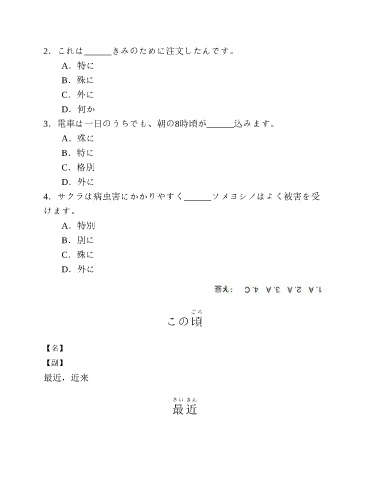 2.これは______きみのために注文したんです。 A.特に B.殊に C.外に D.何か 3.電車は一日のうちでも、朝の8時頃が______込みます。 A.殊に B.特に C.格別 D.外に 4.サクラは病虫害にかかりやすく______ソメヨシノはよく被害を受 けます。 A.特別 B.別に C.殊に D.外に ごろ この頃 【名】 【副】 最近,近来 さい きん 最 近