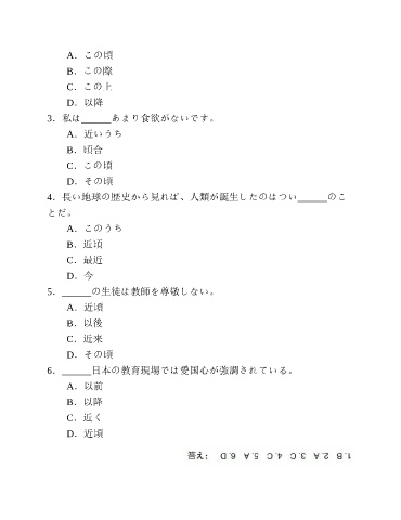 A.この頃 B.この際 C.この上 D.以降 3.私は______あまり食欲がないです。 A.近いうち B.頃合 C.この頃 D.その頃 4.長い地球の歴史から見れば、人類が誕生したのはつい______のこ とだ。 A.このうち B.近頃 C.最近 D.今 5.______の生徒は教師を尊敬しない。 A.近頃 B.以後 C.近来 D.その頃 6.______日本の教育現場では愛国心が強調されている。 A.以前 B.以降 C.近く D.近頃