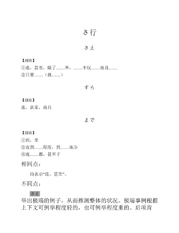 さ行 さえ 【副助】 ①连,甚至,除了……外,……不仅……而且…… ②只要……(就……) すら 【副助】 连,甚至,尚且 まで 【副助】 ①到,至 ②直到……程度,到……地步 ③连……都,甚至于 相同点: 均表示“连、甚至”。 不同点: さえ 举出极端的例子,从而推测整体的状况。极端事例根据 上下文可例举程度轻的,也可例举程度重的。后项肯