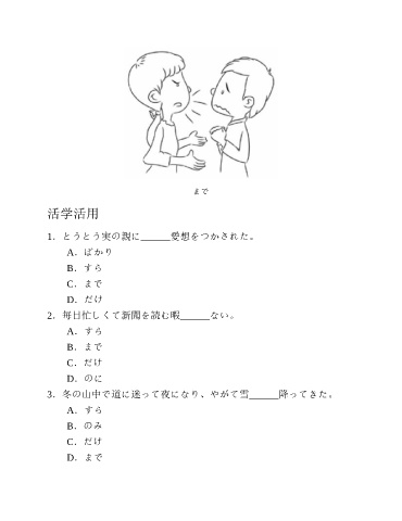 まで 活学活用 1.とうとう実の親に______愛想をつかされた。 A.ばかり B.すら C.まで D.だけ 2.毎日忙しくて新聞を読む暇______ない。 A.すら B.まで C.だけ D.のに 3.冬の山中で道に迷って夜になり、やがて雪______降ってきた。 A.すら B.のみ C.だけ D.まで
