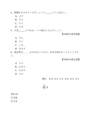 4.新聞はおろかテレビのニュース______ろくに見ない。 A.まで B.でも C.すら D.のみ 5.天気______よければ、よい旅行になるでしょう。 【1994年2级真题】 A.さえ B.すら C.しか D.ばかり 6.電話番号______わかればいいので、住所は書かなくてもいいです よ。 【1999年2级真题】 A.すら B.ばかり C.かぎり D.さえ さが 探す 【他五】 ①寻找 ②寻求