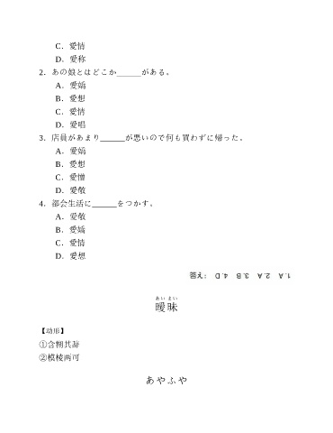 C.愛情 D.愛称 2.あの娘とはどこか______がある。 A.愛嬌 B.愛想 C.愛情 D.愛唱 3.店員があまり______が悪いので何も買わずに帰った。 A.愛嬌 B.愛想 C.愛憎 D.愛敬 4.都会生活に______をつかす。 A.愛敬 B.愛嬌 C.愛情 D.愛想 あい まい 曖 昧 【动形】 ①含糊其辞 ②模棱两可 あやふや