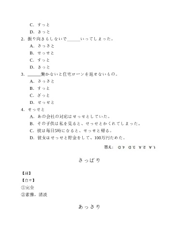 C.すっと D.きっと 2.振り向きもしないで______いってしまった。 A.さっさと B.せっせと C.すっと D.きっと 3.______働かないと住宅ローンを返せないもの。 A.さっさと B.すっと C.ざっと D.せっせと 4.せっせと A.あの会社の対応はせっせとしていた。 B.その子供は私を見ると、せっせとかくれてしまった。 C.彼は毎日5時になると、せっせと帰る。 D.彼女はせっせと貯金をして、100万円ためた。 さっぱり 【副】 【自サ】 ①完全 ②素雅,清淡 あっさり