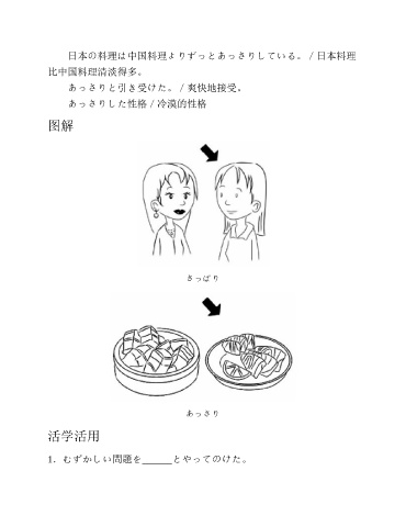 日本の料理は中国料理よりずっとあっさりしている。/日本料理 比中国料理清淡得多。 あっさりと引き受けた。/爽快地接受。 あっさりした性格/冷漠的性格 图解 さっぱり あっさり 活学活用 1.むずかしい問題を______とやってのけた。