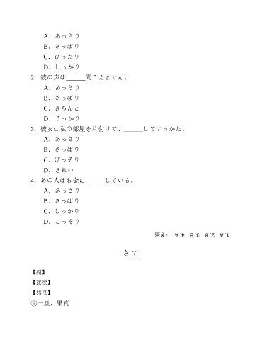 A.あっさり B.さっぱり C.ぴったり D.しっかり 2.彼の声は______聞こえません。 A.あっさり B.さっぱり C.きちんと D.うっかり 3.彼女は私の部屋を片付けて、______してよっかた。 A.あっさり B.さっぱり C.げっそり D.きれい 4.あの人はお金に______している。 A.あっさり B.さっぱり C.しっかり D.こっそり さて 【副】 【接续】 【感叹】 ①一旦,果真