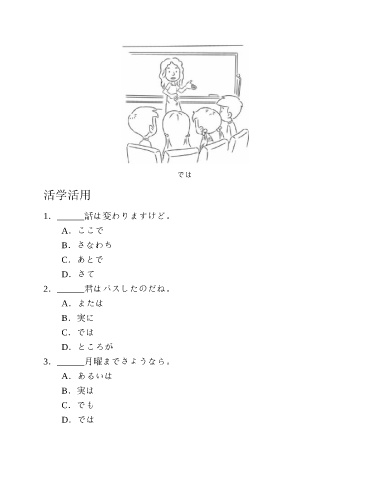 では 活学活用 1.______話は変わりますけど。 A.ここで B.さなわち C.あとで D.さて 2.______君はパスしたのだね。 A.または B.実に C.では D.ところが 3.______月曜までさようなら。 A.あるいは B.実は C.でも D.では