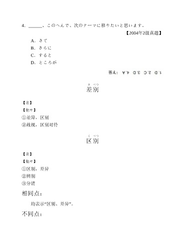 4.______、このへんで、次のテーマに移りたいと思います。 【2004年2级真题】 A.さて B.さらに C.すると D.ところが さ べつ 差 別 【名】 【他サ】 ①差异,区别 ②歧视,区别对待 く べつ 区 別 【名】 【他サ】 ①区别,差异 ②辨别 ③分清 相同点: 均表示“区别、差异”。 不同点: