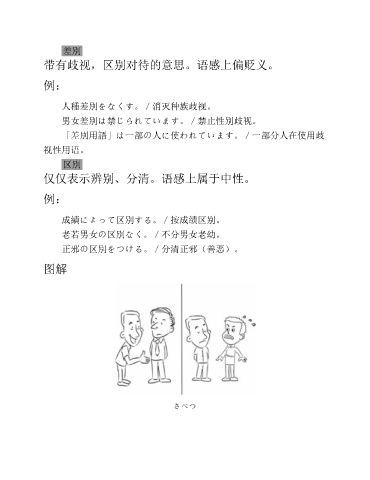 差別 带有歧视,区别对待的意思。语感上偏贬义。 例: 人種差別をなくす。/消灭种族歧视。 男女差別は禁じられています。/禁止性别歧视。 「差別用語」は一部の人に使われています。/一部分人在使用歧 视性用语。 区別 仅仅表示辨别、分清。语感上属于中性。 例: 成績によって区別する。/按成绩区别。 老若男女の区別なく。/不分男女老幼。 正邪の区別をつける。/分清正邪(善恶)。 图解 さべつ