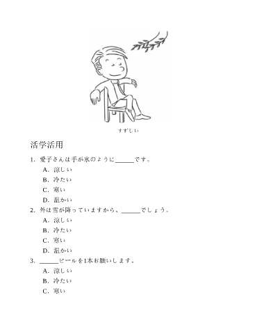 すずしい 活学活用 1.愛子さんは手が氷のように______です。 A.涼しい B.冷たい C.寒い D.温かい 2.外は雪が降っていますから、______でしょう。 A.涼しい B.冷たい C.寒い D.温かい 3.______ビールを1本お願いします。 A.涼しい B.冷たい C.寒い