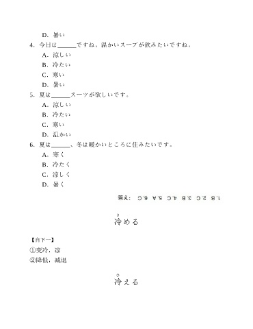 D.暑い 4.今日は______ですね。温かいスープが飲みたいですね。 A.涼しい B.冷たい C.寒い D.暑い 5.夏は______スーツが欲しいです。 A.涼しい B.冷たい C.寒い D.温かい 6.夏は______、冬は暖かいところに住みたいです。 A.寒く B.冷たく C.涼しく D.暑く さ 冷める 【自下一】 ①变冷,凉 ②降低,减退 ひ 冷える