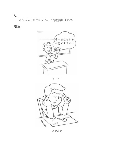 人。 あやふやな返事をする。/含糊其词地回答。 图解 あいまい あやふや