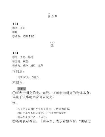 あ 明かり 【名】 ①光,亮儿 ②灯 ③希望,光明【名】 ひかり 光 【名】 ①光,光亮,光线 ②光明,希望 ③威力,威势,威望,光荣 相同点: 均表示“光、希望”。 不同点: 明かり ①可表示明亮的光、光线,还可表示明亮的物体本身。 偏重于该事物本身可以发光。 例: ろうそくの明かりで本を読む。/借烛光看书。 月の明かりが窓に差す。/月光照射着窗户。 明かりをつける。/点灯。 ②还可表示希望。「明かり」表示希望本身。“黑暗过