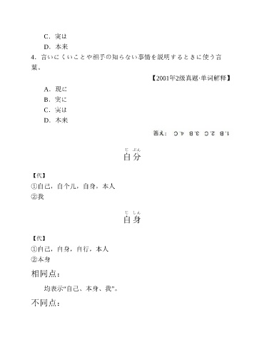 C.実は D.本来 4.言いにくいことや相手の知らない事情を説明するときに使う言 葉。 【2001年2级真题·单词解释】 A.現に B.実に C.実は D.本来 じ ぶん 自 分 【代】 ①自己,自个儿,自身,本人 ②我 じ しん 自 身 【代】 ①自己,自身,自行,本人 ②本身 相同点: 均表示“自己、本身、我”。 不同点: