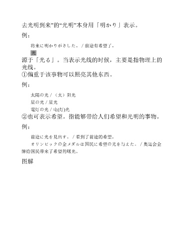 去光明到来”的“光明”本身用「明かり」表示。 例: 将来に明かりがさした。/前途有希望了。 光 源于「光る」。当表示光线的时候,主要是指物理上的 光线。 ①偏重于该事物可以照亮其他东西。 例: 太陽の光/(太)阳光 星の光/星光 電灯の光/电(灯)光 ②也可表示希望。指能够带给人们希望和光明的事物。 例: 前途に光を見出す。/看到了前途的希望。 オリンピックの金メダルは国民に希望の光を与えた。/奥运会金 牌给国民带来了希望的曙光。 图解