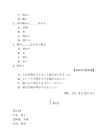 C.明るい D.輝く 2.木の間から______がさす。 A.光明 B.光 C.明かり D.明ける 3.親の______をかさに着る。 A.明かり B.光 C.明日 D.日々 4.明かり 【2001年2级真题】 A.それが明かりとなって犯人がつかまった。 B.ストーブの明かりでお湯をわかした。 C.暗いから明かりをつけてください。 D.夏の太陽の明かりはまぶしい。 あ 上がる 【自五】 ①上,登上 ②抬起,升高 ③出,发出