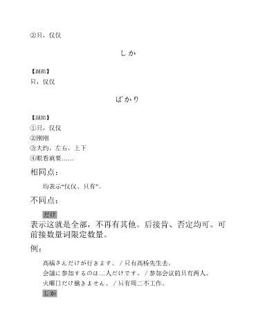②只,仅仅 しか 【副助】 只,仅仅 ばかり 【副助】 ①只,仅仅 ②刚刚 ③大约,左右,上下 ④眼看就要…… 相同点: 均表示“仅仅、只有”。 不同点: だけ 表示这就是全部,不再有其他。后接肯、否定均可。可 前接数量词限定数量。 例: 高橋さんだけが行きます。/只有高桥先生去。 会議に参加するのは二人だけです。/参加会议的只有两人。 火曜日だけ働きません。/只有周二不工作。 しか
