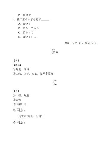 D.授けて 4.彼の家のかぎは私が______。 A.預けて B.預かっている C.預かって D.預けている あた 辺り 【名】 【接尾】 ①附近,周围 ②大约,上下,左右,差不多那样 へん 辺 【名】 ①一带,附近 ②大致 ③〈数〉边 相同点: 均表示“附近、周围”。 不同点: