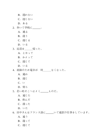 B.通わない C.通じない D.ある 2.歩いて学校に______。 A.通る B.通う C.通じる D.いる 3.近道を______帰った。 A.とおって B.かよって C.通じて D.いる 4.故障のため電車が一時______なくなった。 A.通わ B.通じ C.い D.帰ら 5.若い時そこへはよく______ものだ。 A.通じた B.休んだ C.通った D.いた 6.田中さんはフランス語に______いて通訳の仕事をしています。 A.通う B.通って C.通じて