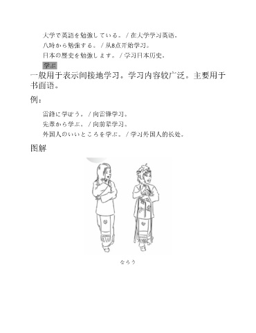 大学で英語を勉強している。/在大学学习英语。 八時から勉強する。/从8点开始学习。 日本の歴史を勉強します。/学习日本历史。 学ぶ 一般用于表示间接地学习。学习内容较广泛。主要用于 书面语。 例: 雷鋒に学ぼう。/向雷锋学习。 先輩から学ぶ。/向前辈学习。 外国人のいいところを学ぶ。/学习外国人的长处。 图解 ならう