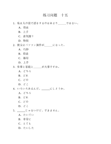 练习问题 十五 1.私は人の前で話をするのはあまり______ではない。 A.得意 B.上手 C.意気揚々 D.特技 2.彼女はパソコン操作が______になった。 A.巧妙 B.得意 C.器用 D.上手 3.仕事と家庭と______が大事ですか。 A.どちら B.どれ C.どの D.どこ 4.いろいろあるんだ。______にしようか。 A.どちら B.どれ C.どの D.どこ 5.______じゃないけど、できません。 A.たいてい B.非常に C.とても D.たいした