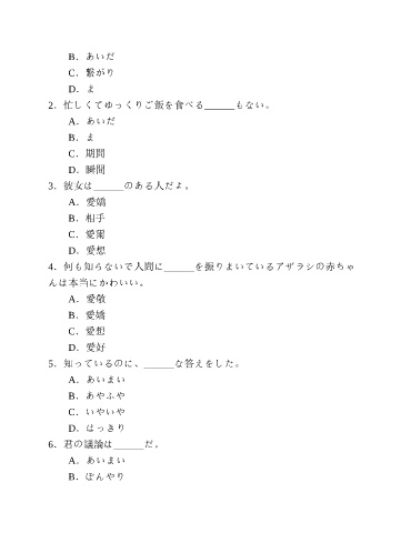 B.あいだ C.繋がり D.ま 2.忙しくてゆっくりご飯を食べる______もない。 A.あいだ B.ま C.期間 D.瞬間 3.彼女は______のある人だよ。 A.愛嬌 B.相手 C.愛爾 D.愛想 4.何も知らないで人間に______を振りまいているアザラシの赤ちゃ んは本当にかわいい。 A.愛敬 B.愛嬌 C.愛想 D.愛好 5.知っているのに、______な答えをした。 A.あいまい B.あやふや C.いやいや D.はっきり 6.君の議論は______だ。 A.あいまい B.ぼんやり