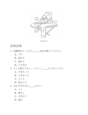 かわかす 活学活用 1.洗濯物をもっと早く______方法を教えてください。 A.干す B.乾かす C.枯れる D.干上がる 2.そこは陰ですから、こちらへ______ほうがいいです。 A.日当たった B.干上がった C.干した D.乾かした 3.ぬれた手を火で______なさい。 A.干し B.乾かし C.火当たり D.焼き