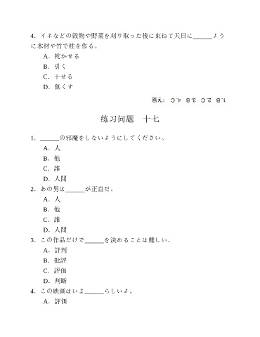 4.イネなどの穀物や野菜を刈り取った後に束ねて天日に______よう に木材や竹で柱を作る。 A.乾かせる B.引く C.干せる D.無くす 练习问题 十七 1.______の邪魔をしないようにしてください。 A.人 B.他 C.誰 D.人間 2.あの男は______が正直だ。 A.人 B.他 C.誰 D.人間 3.この作品だけで______を決めることは難しい。 A.評判 B.批評 C.評価 D.判断 4.この映画はいま______らしいよ。 A.評価