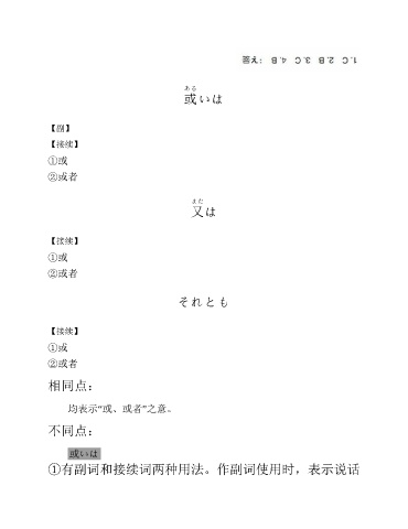 ある 或いは 【副】 【接续】 ①或 ②或者 また 又は 【接续】 ①或 ②或者 それとも 【接续】 ①或 ②或者 相同点: 均表示“或、或者”之意。 不同点: 或いは ①有副词和接续词两种用法。作副词使用时,表示说话
