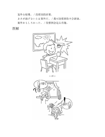 案外な結果。/没想到的结果。 きみが泳げないとは案外だ。/我可没想到你不会游泳。 案外おもしろかった。/没想到会这么有趣。 图解 いがい