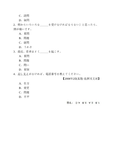 C.設問 D.疑問 2.朝からいろいろな______を受けなければならない」と思ったら、 頭が痛いです。 A.質問 B.問題 C.疑問 D.うわさ 3.最近、若者はよく______を起こす。 A.質問 B.問題 C.問い D.質疑 4.差し支えがなければ、電話番号を教えてください。 【2008年2级真题·选择同义词】 A.仕方 B.変更 C.問題 D.不平