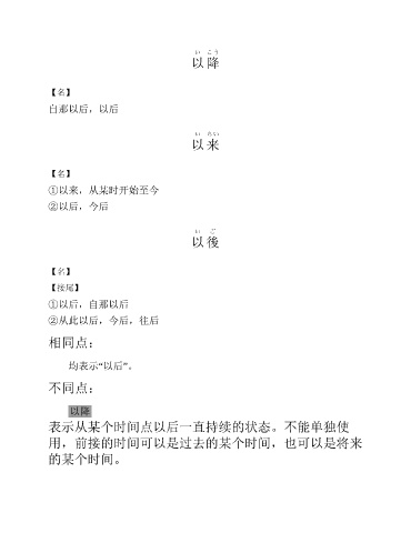 い こう 以 降 【名】 自那以后,以后 い らい 以 来 【名】 ①以来,从某时开始至今 ②以后,今后 い ご 以 後 【名】 【接尾】 ①以后,自那以后 ②从此以后,今后,往后 相同点: 均表示“以后”。 不同点: 以降 表示从某个时间点以后一直持续的状态。不能单独使 用,前接的时间可以是过去的某个时间,也可以是将来 的某个时间。
