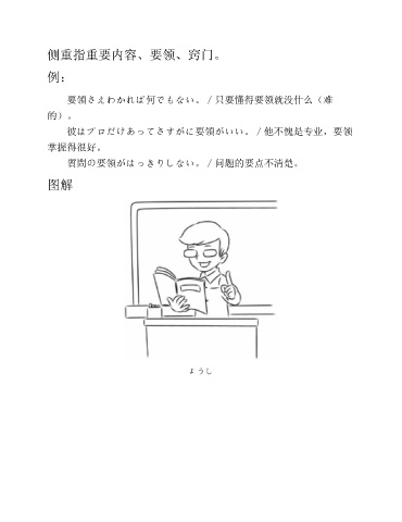 侧重指重要内容、要领、窍门。 例: 要領さえわかれば何でもない。/只要懂得要领就没什么(难 的)。 彼はプロだけあってさすがに要領がいい。/他不愧是专业,要领 掌握得很好。 質問の要領がはっきりしない。/问题的要点不清楚。 图解 ようし