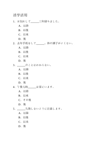 活学活用 1.お別れして______三年経ちました。 A.以降 B.以後 C.以来 D.後 2.去年手術をして______、体の調子がよくない。 A.以降 B.以後 C.以来 D.後 3.______のことはわからない。 A.以降 B.以後 C.以来 D.後 4.午後七時______は家にいます。 A.以降 B.以来 C.その後 D.後 5.______失敗しないように注意します。 A.以降 B.以後 C.以来 D.後